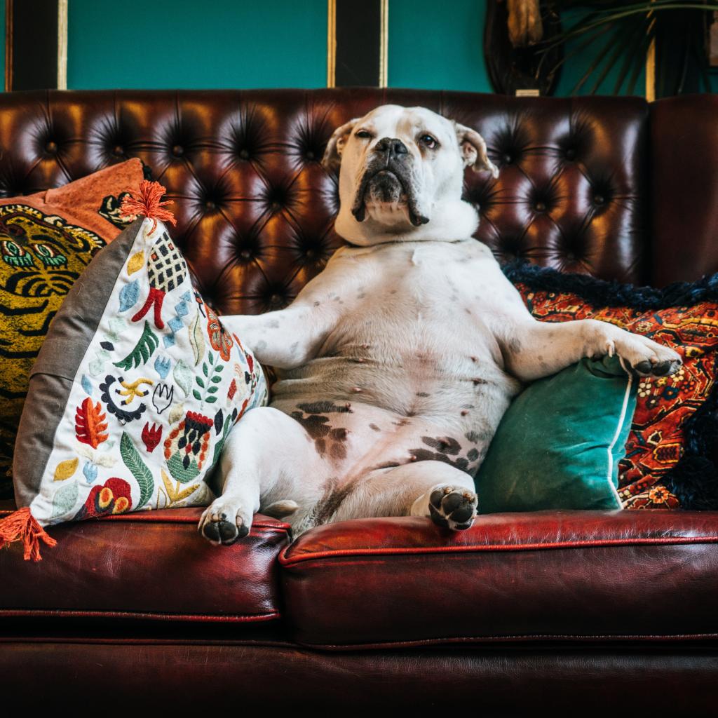 Обои Большой белый бульдог лежит на кожаном диване с подушками