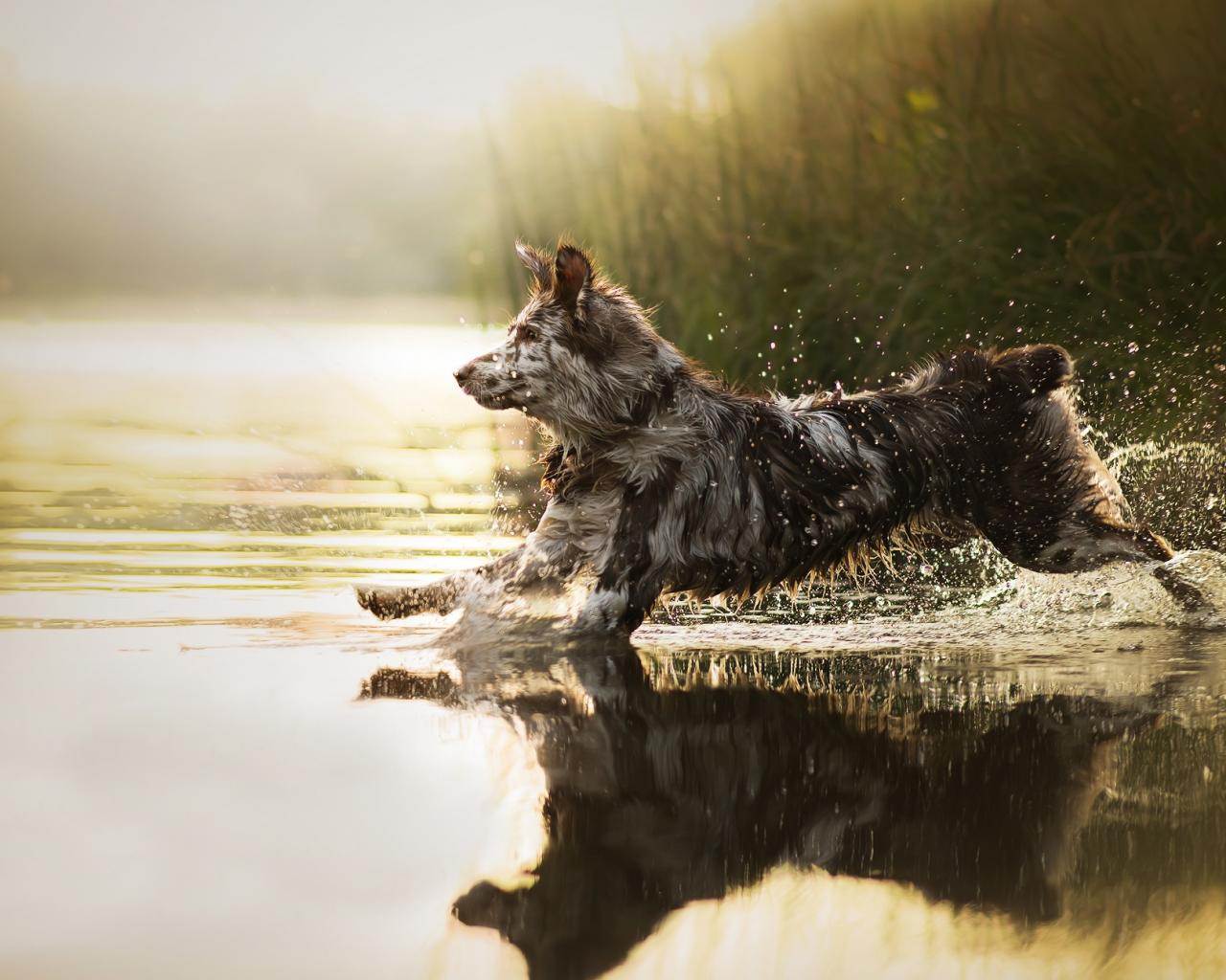 Обои Собака породы бордер колли бежит по воде