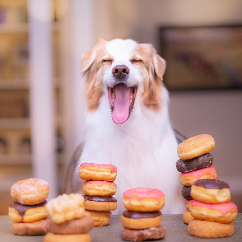 Обои Довольный пес с высунутым языком с пончиками