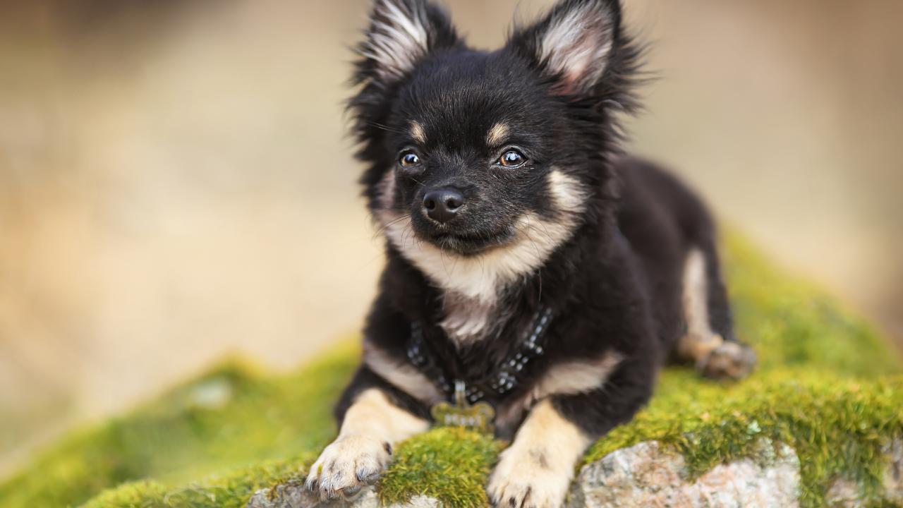 Обои Маленький пес породы чихуахуа лежит на покрытом мхом камне
