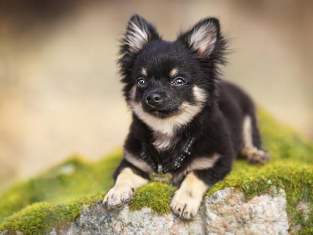 Обои Маленький пес породы чихуахуа лежит на покрытом мхом камне