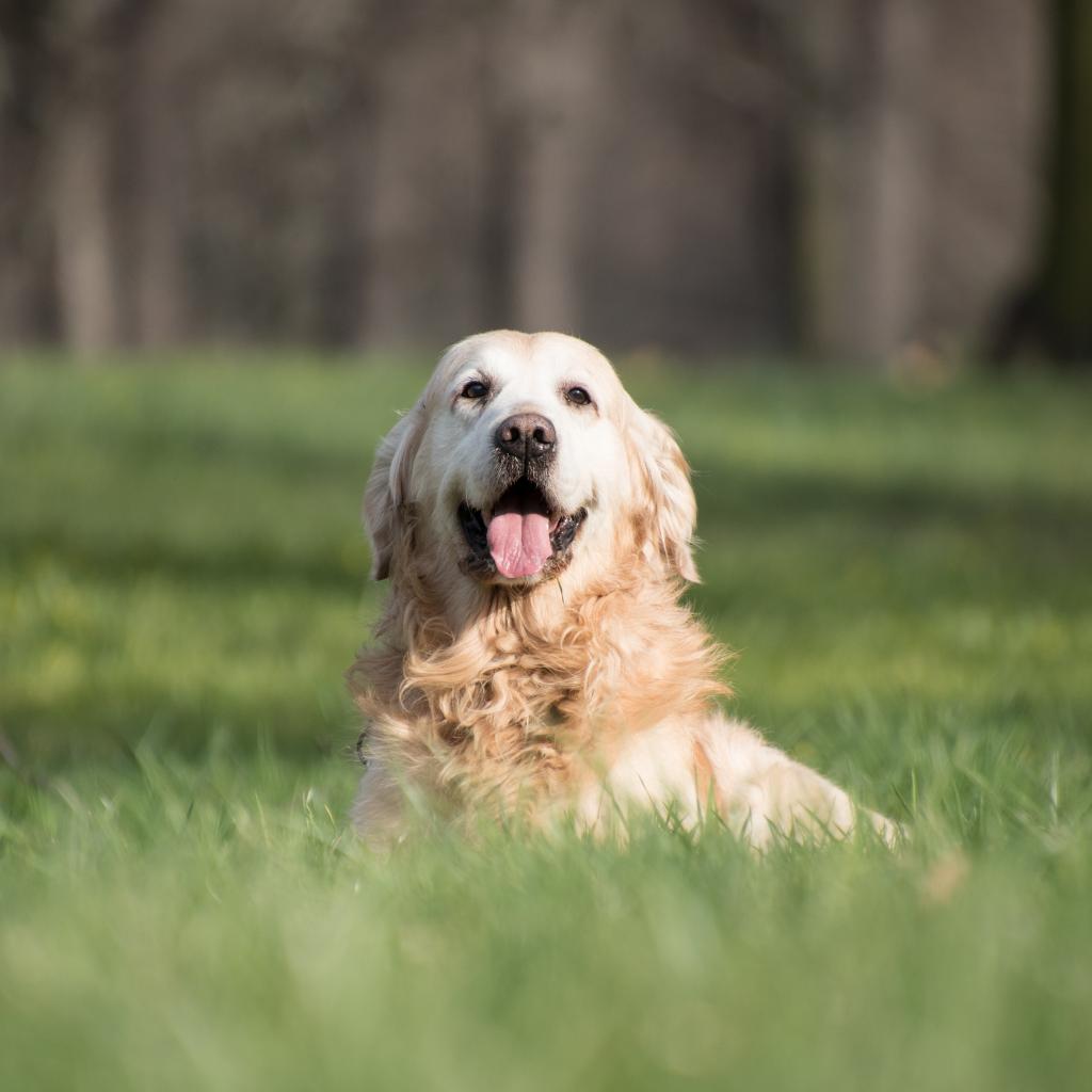 Обои Золотистый ретривер с высунутым языком в зеленой траве