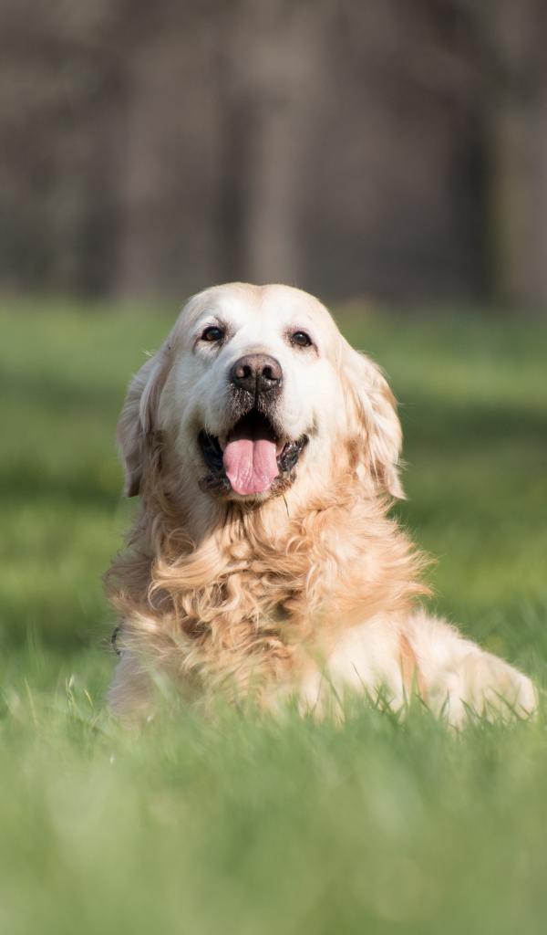 Обои Золотистый ретривер с высунутым языком в зеленой траве