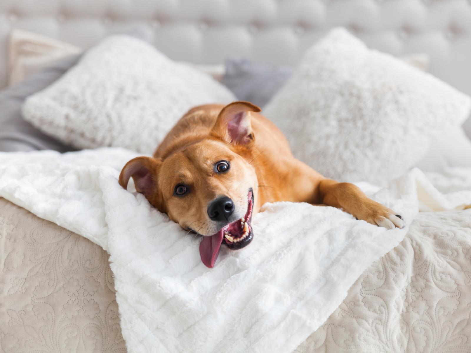 Обои Довольный пес с высунутым языком лежит на белой кровати