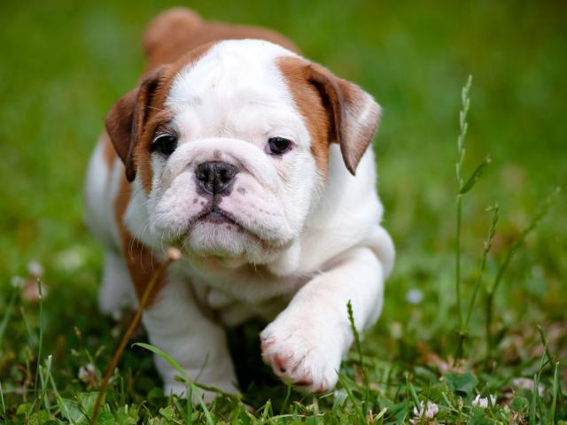 Обои Маленький щенок английского бульдога на зеленой траве