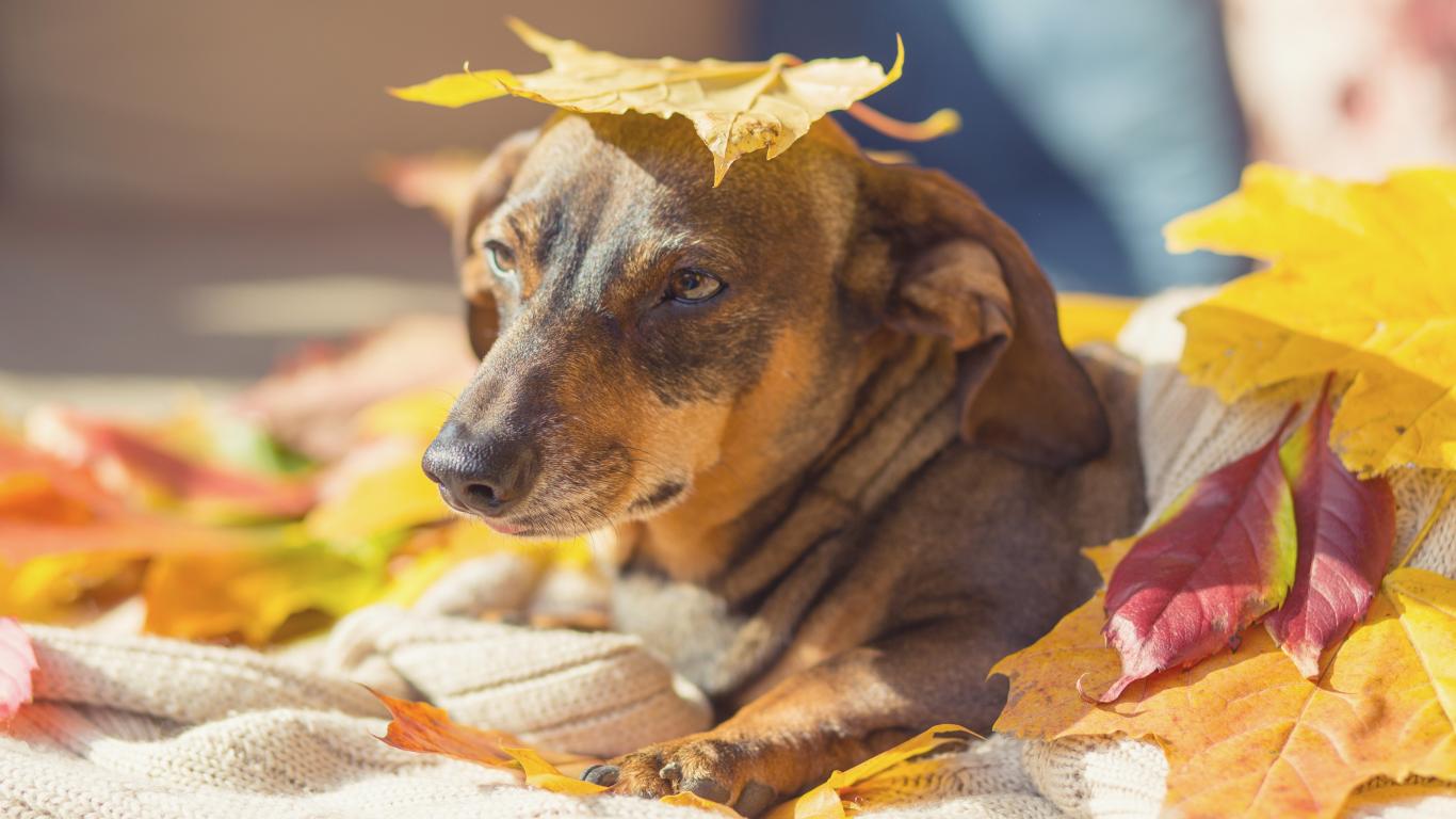 Обои Грустная собака лежит на опавших листьях