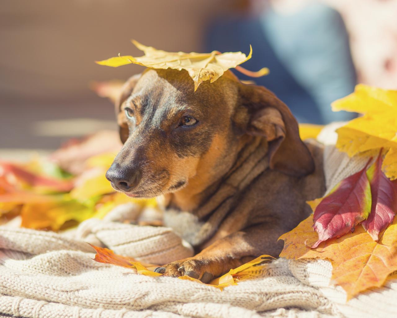 Обои Грустная собака лежит на опавших листьях