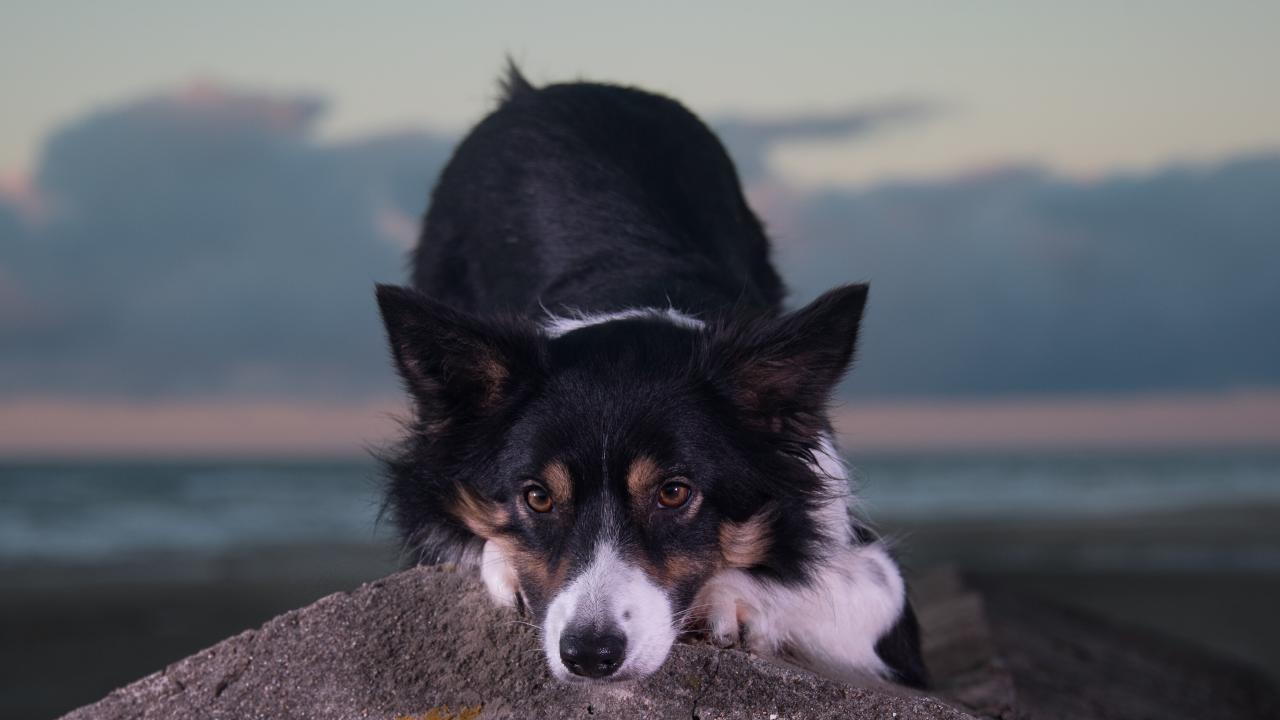 Обои Красивая породистая собака сидит в сиреневых цветах