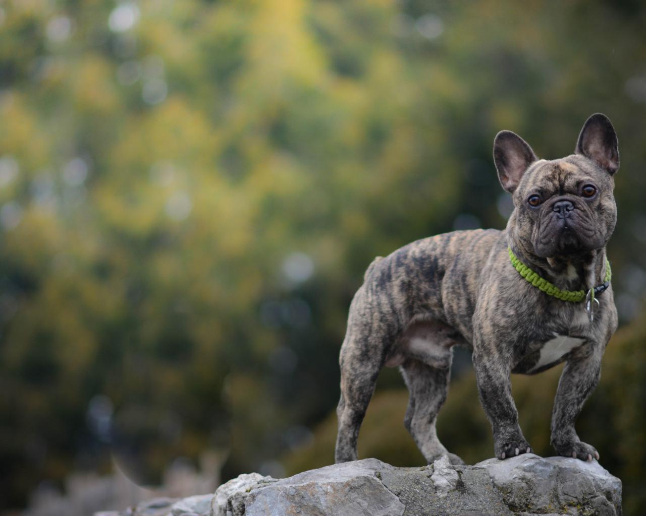 Обои Французский бульдог стоит на камне