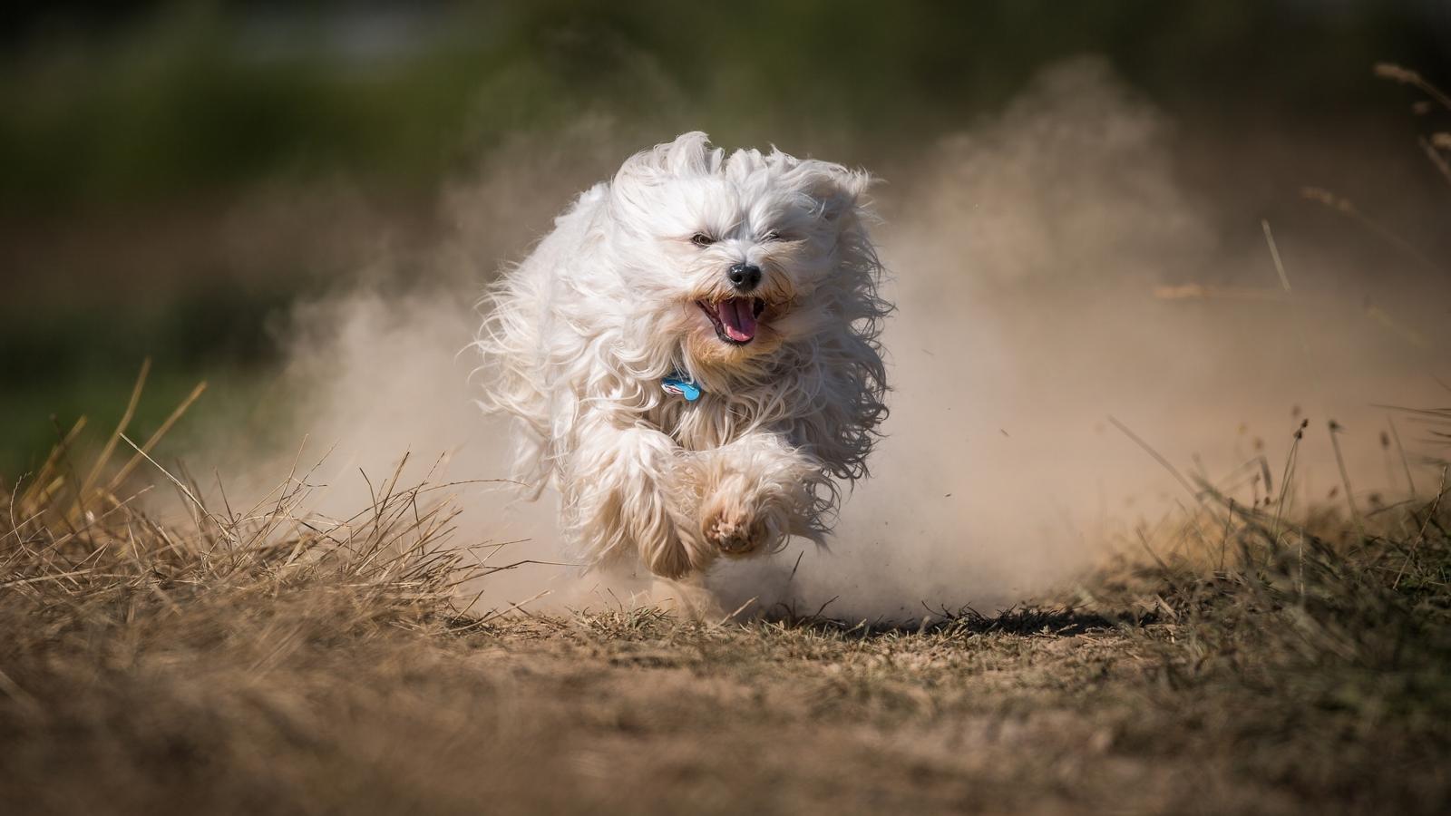 Обои Белая пушистая собака бежит по дороге в пыли