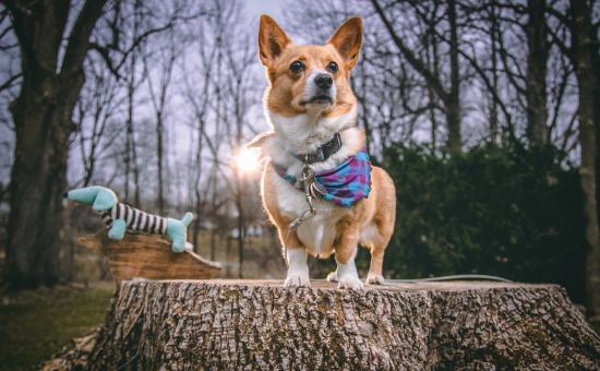 Обои Собака породы вельш корги стоит на пне