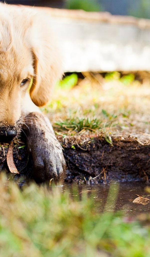 Обои Золотистый ретривер с грязными лапами у лужи