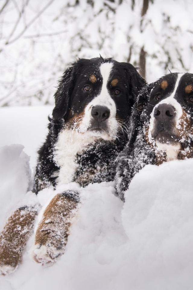 Обои Две собаки Бернский зенненхунд лежат на снегу