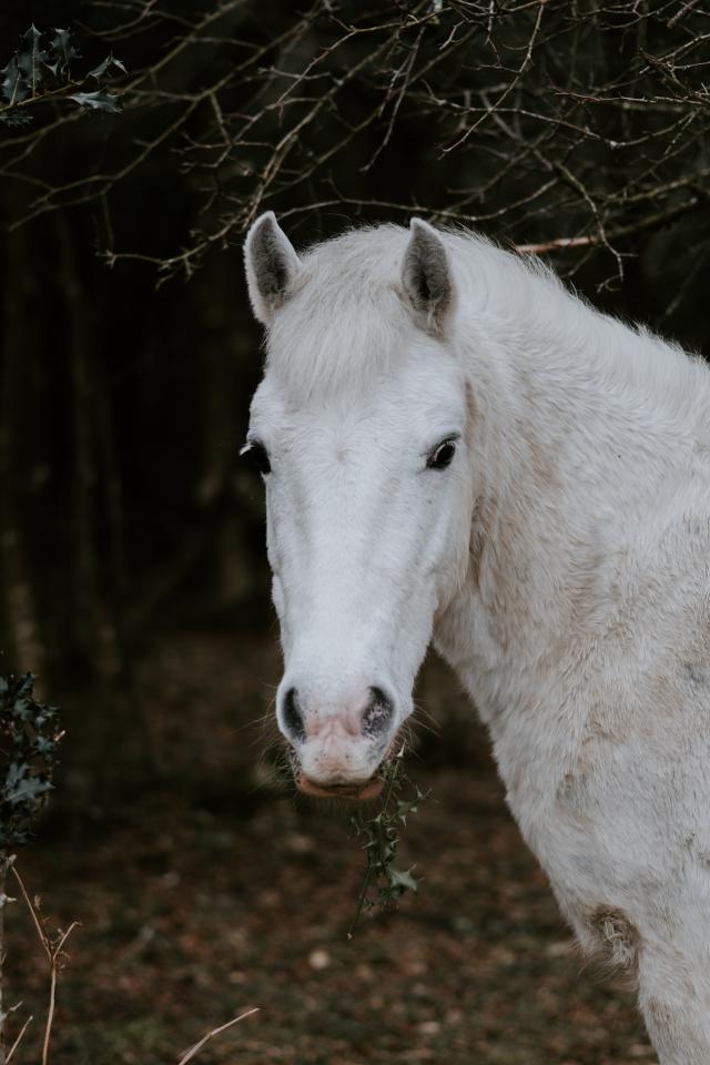 Обои Белая лошадь пасется в лесу
