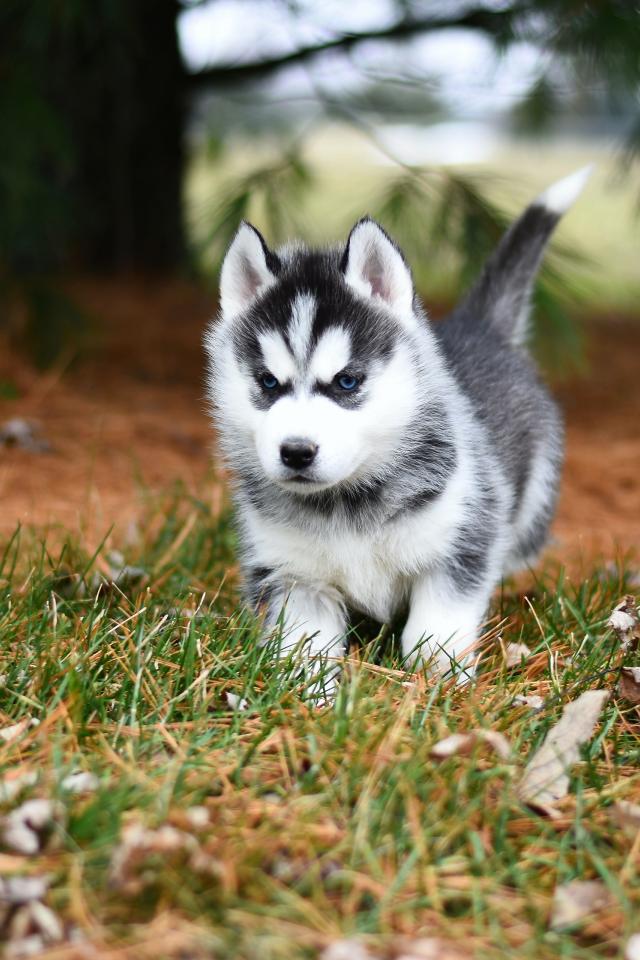 Обои Голубоглазый щенок хаски бежит по зеленой траве