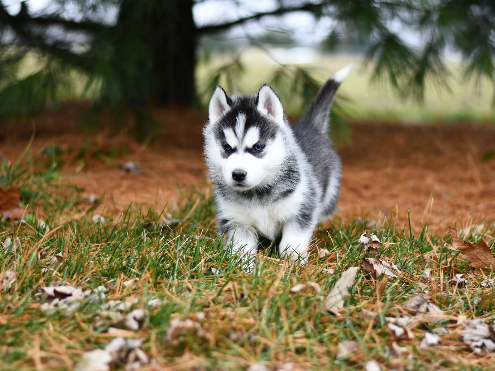 Обои Голубоглазый щенок хаски бежит по зеленой траве