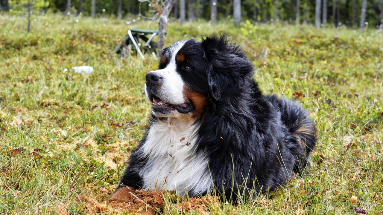 Обои Бернский зенненхунд отдыхает на зеленой траве