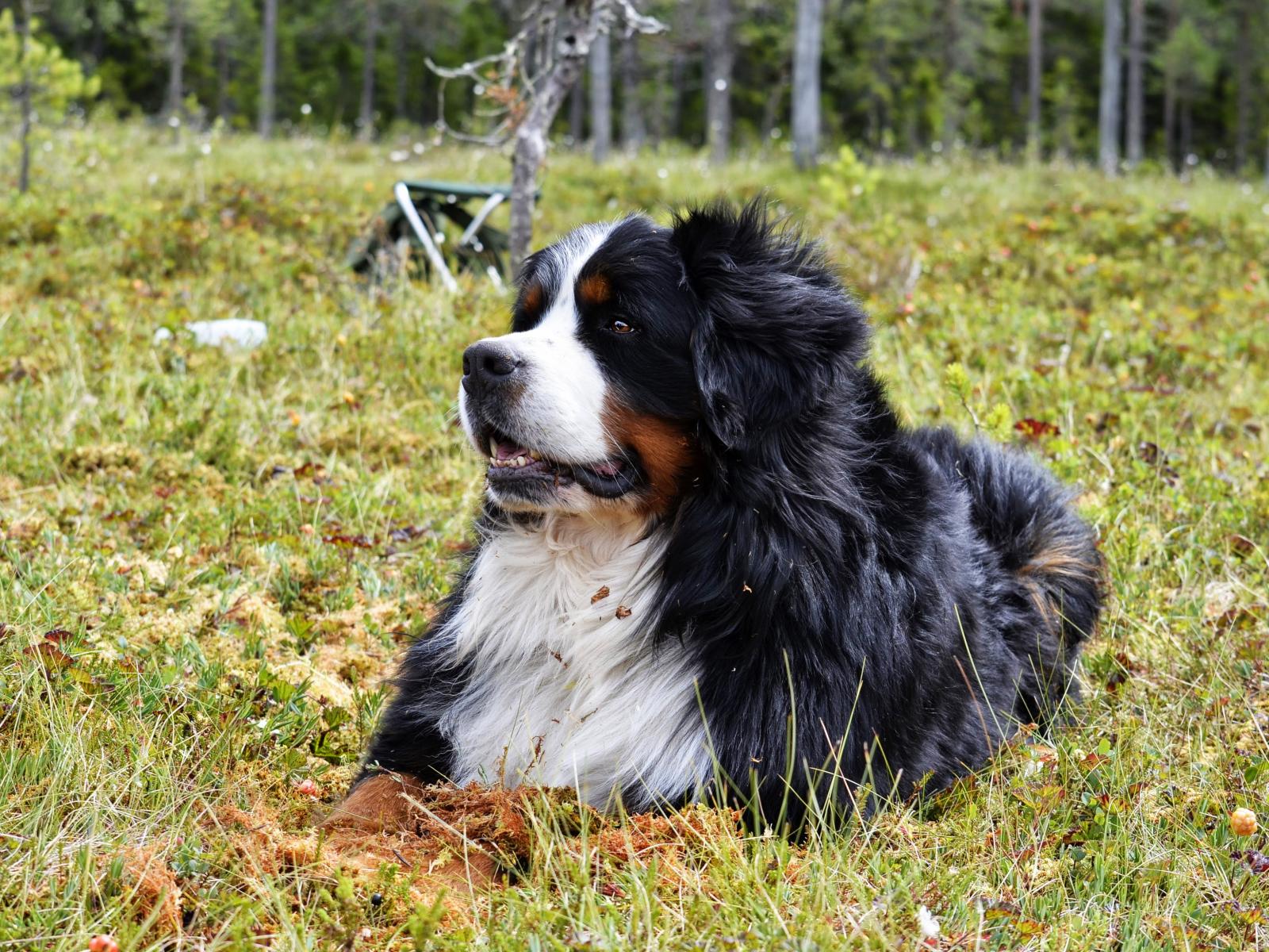 Обои Бернский зенненхунд отдыхает на зеленой траве