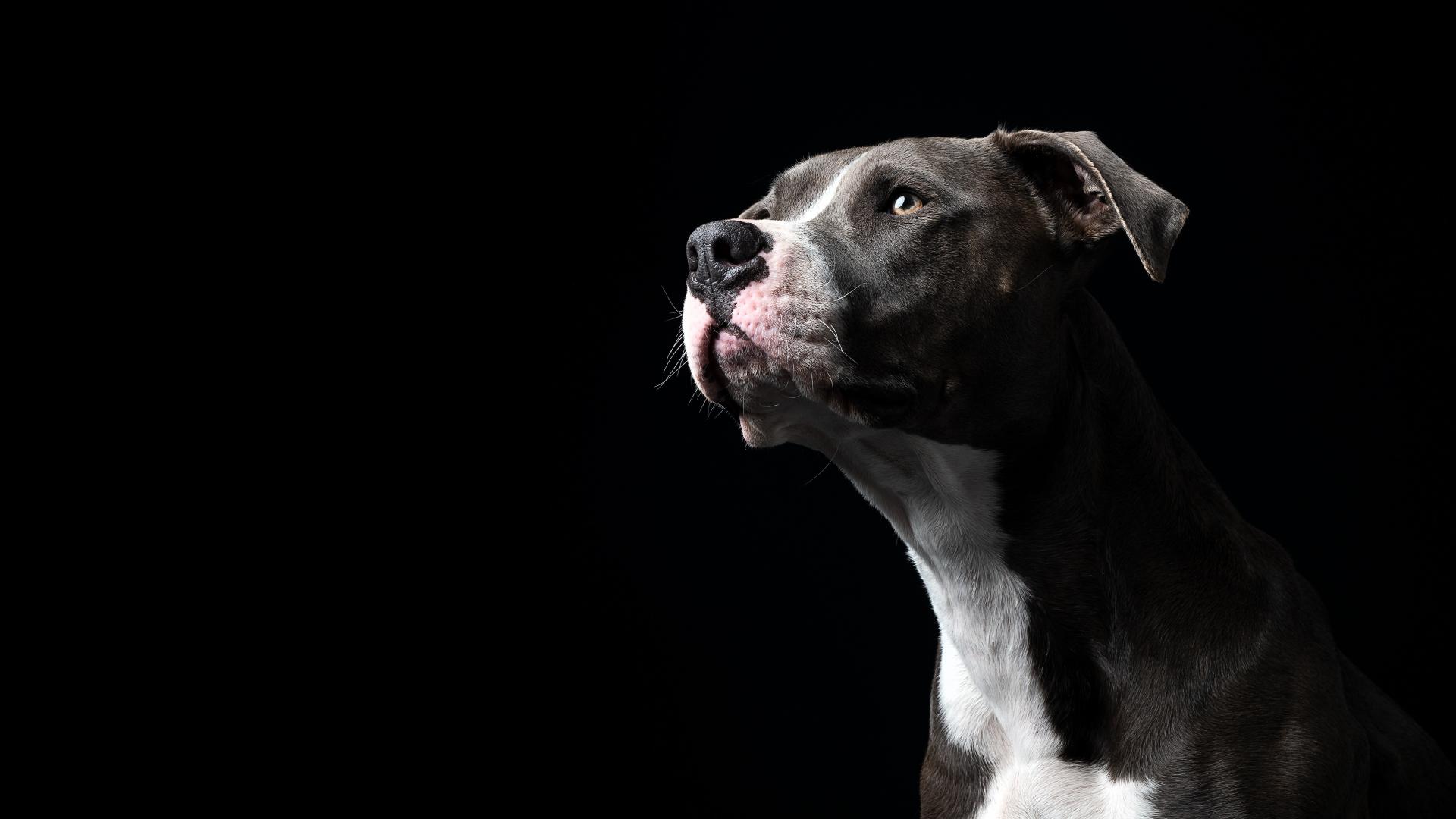 Обои Бультерьер смотрит вдаль на черном фоне