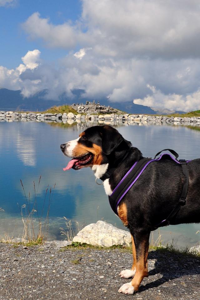Обои Бернский зенненхунд с высунутым языком у воды