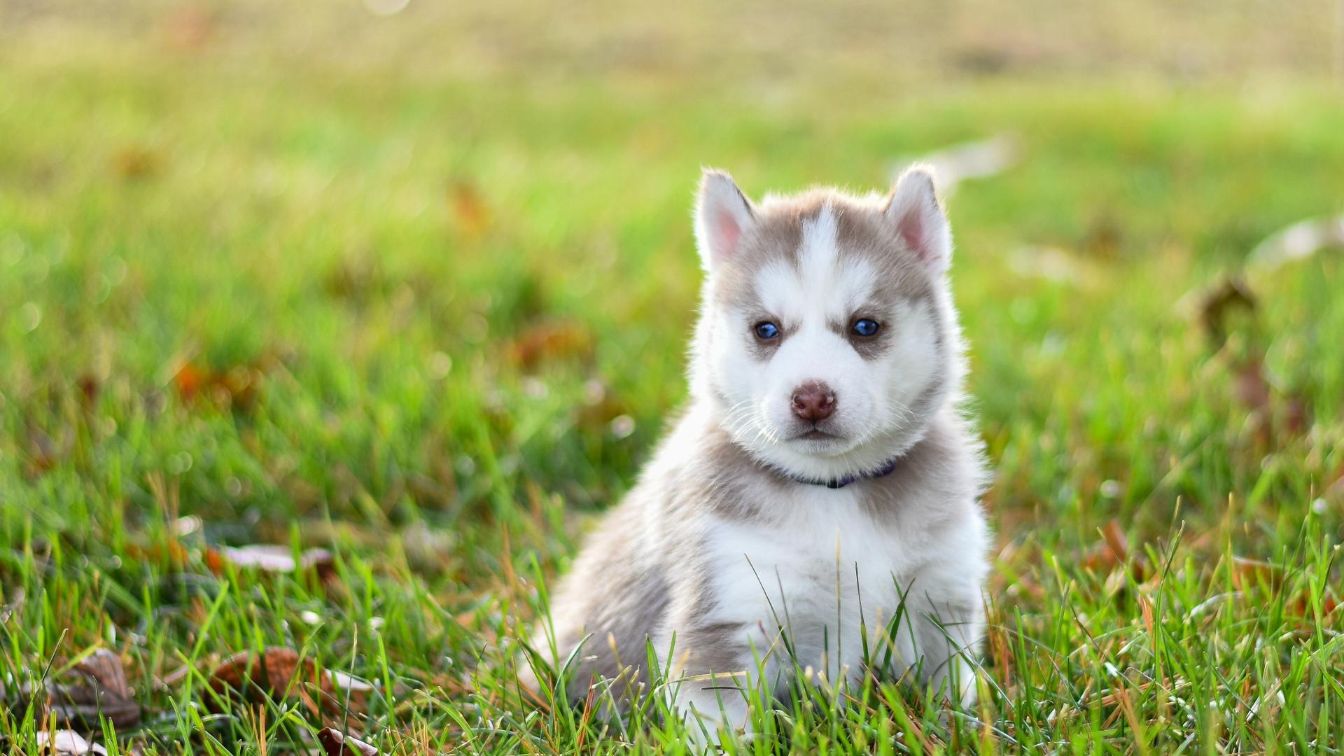 Обои Задумчивый щенок хаски сидит на зеленой траве