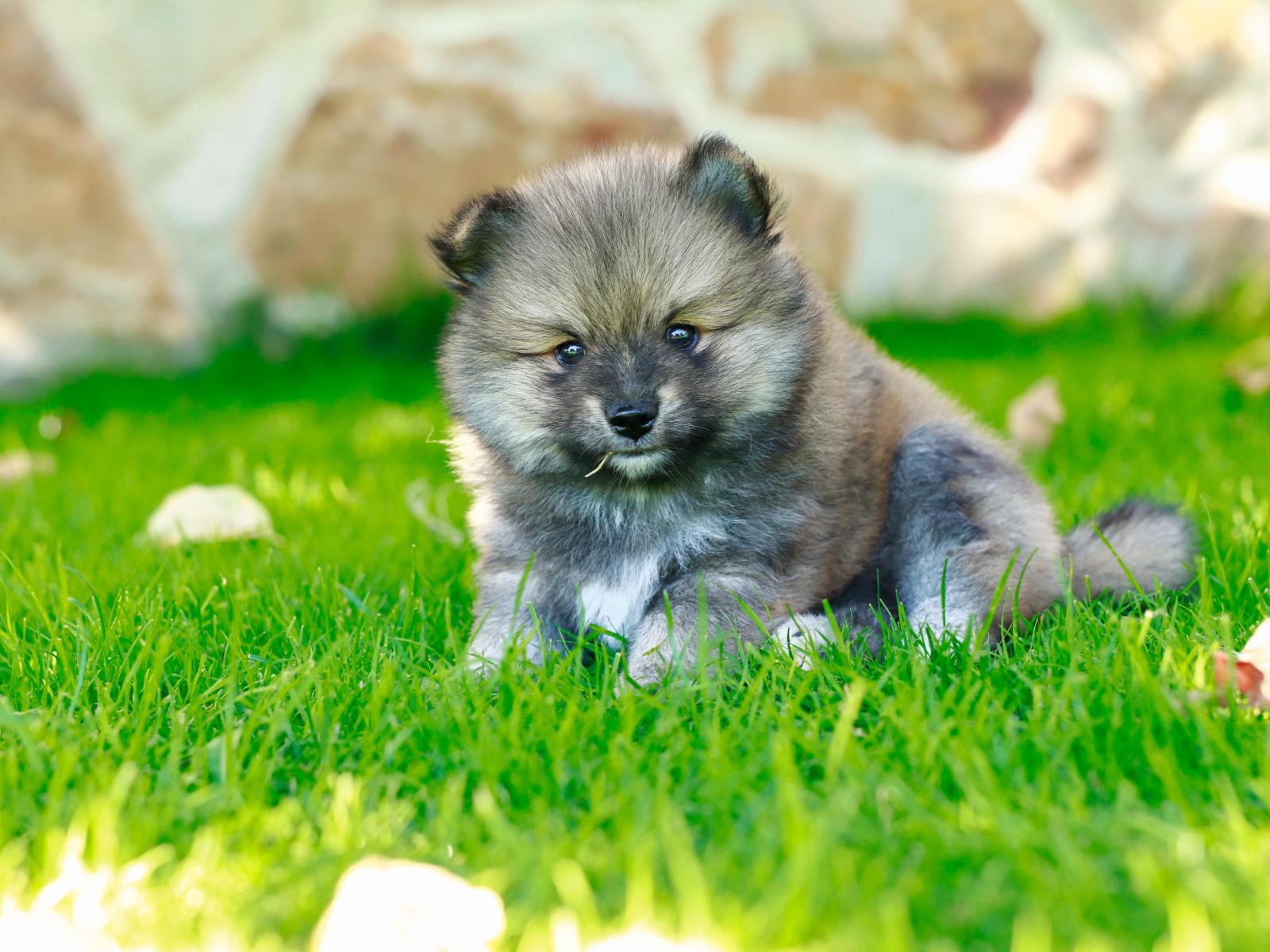 Обои Маленький щенок померанского шпица на зеленой траве