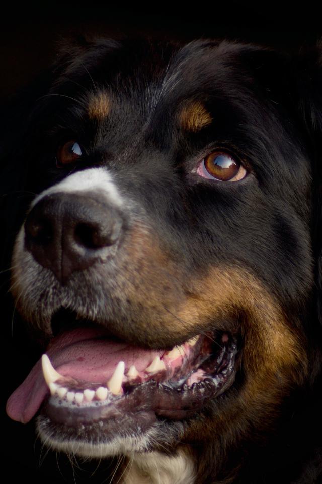 Обои Бернский зенненхунд с высунутым языком на черном фоне