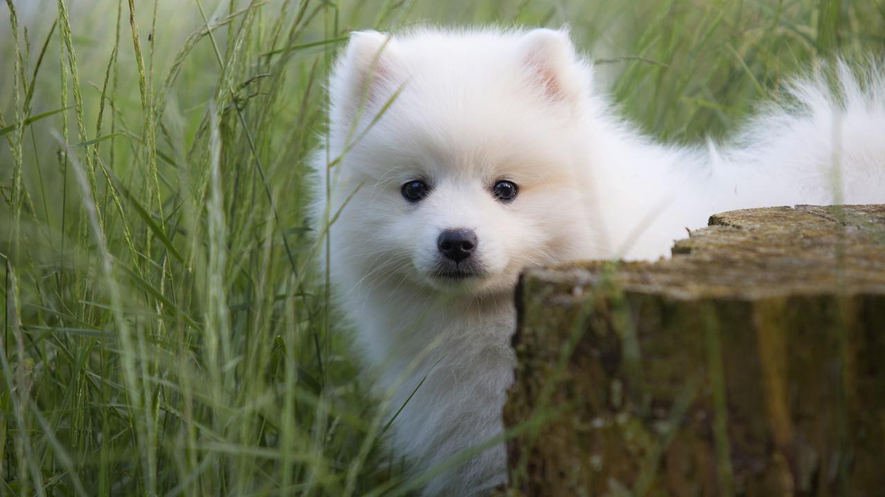 Обои Маленький пушистый белый щенок шпица в зеленой траве