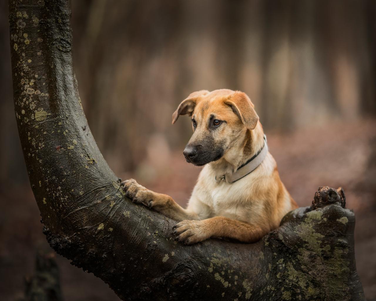 Обои Маленький щенок сидит на сухом дереве в лесу