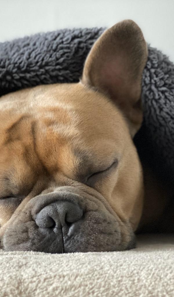 Обои Спящий французский бульдог под одеялом