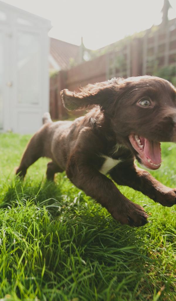 Обои Маленький веселый щенок бежит по траве