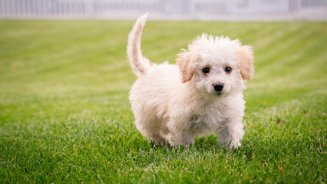 Обои Маленький белый пушистый щенок на зеленом газоне