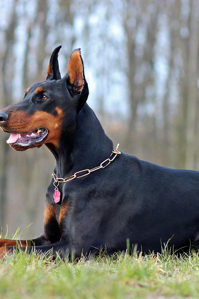 Обои Серьезный доберман лежит на зеленой траве