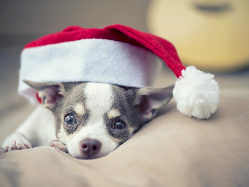 Обои Собака породы чихуахуа лежит на кровати в шапке