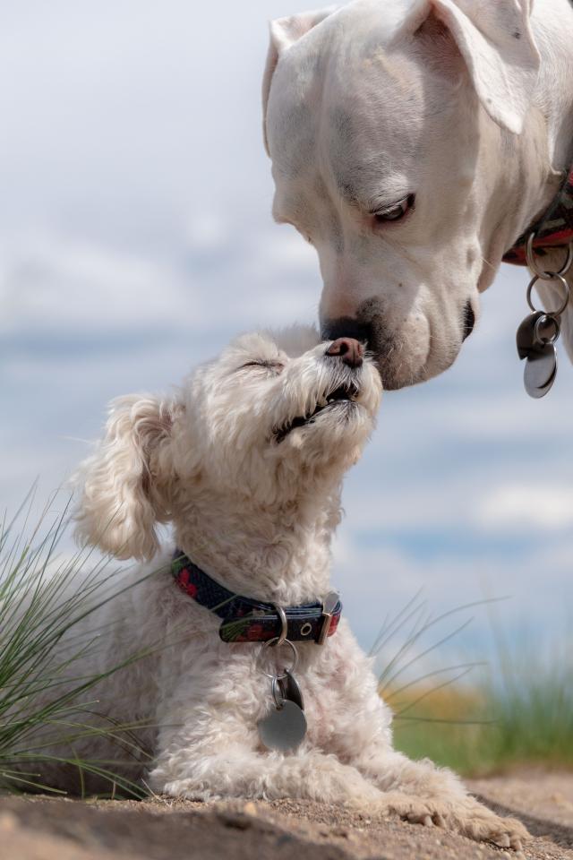 Обои Маленький пудель с большим боксером на пляже