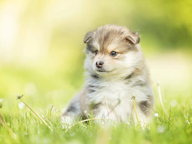 Обои Маленький пушистый щенок сидит в зеленой траве