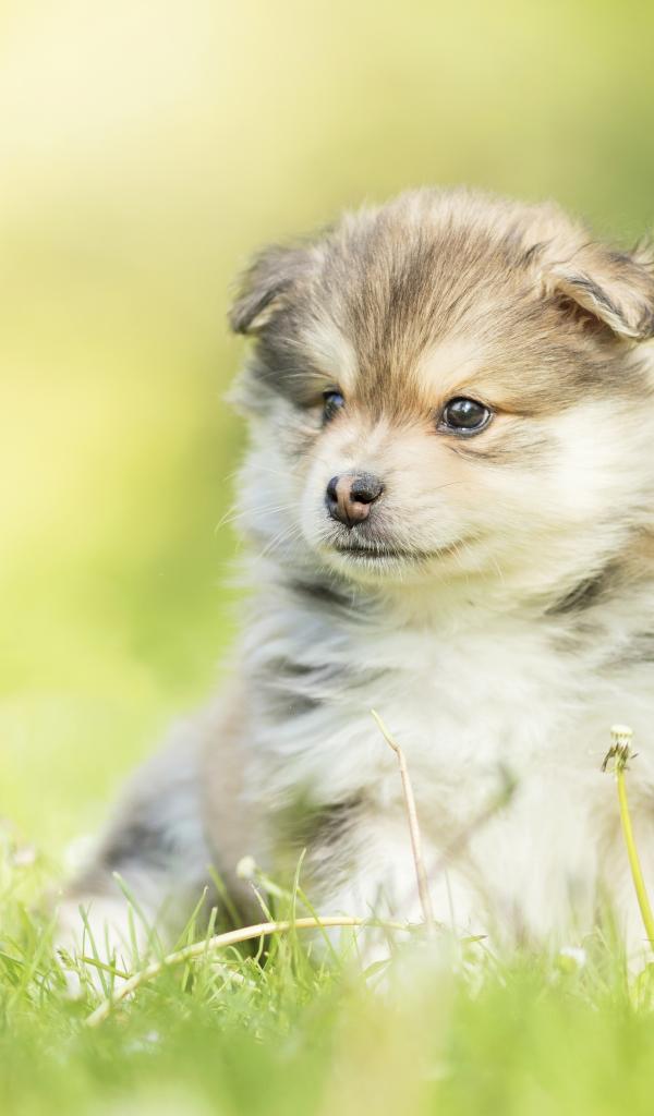 Обои Маленький пушистый щенок сидит в зеленой траве