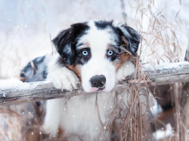 Обои Австралийская овчарка с голубыми глазами у забора