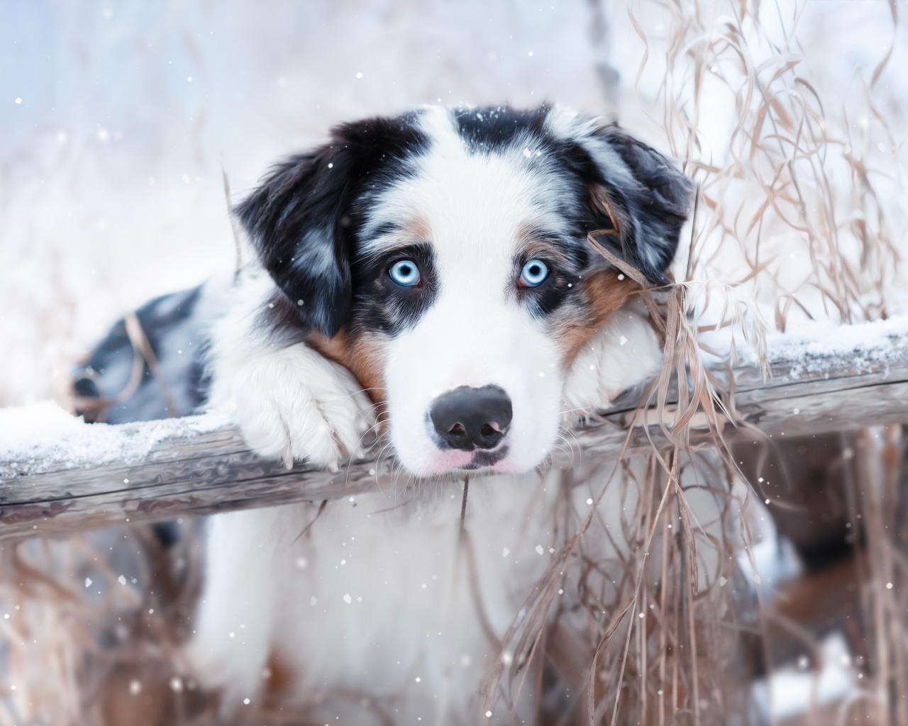 Обои Австралийская овчарка с голубыми глазами у забора