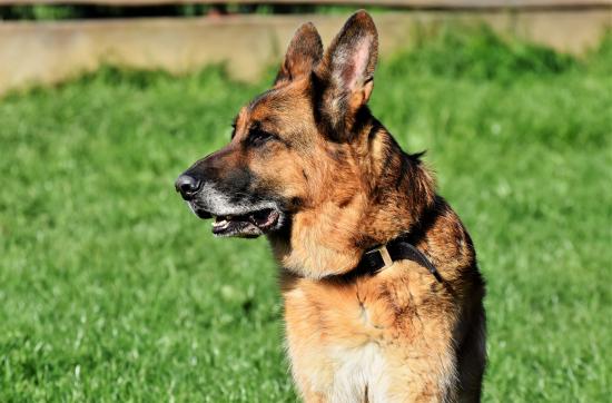 Обои Большая овчарка с открытой пастью сидит на траве