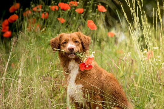 Обои Новошотландский ретривер с красными маками