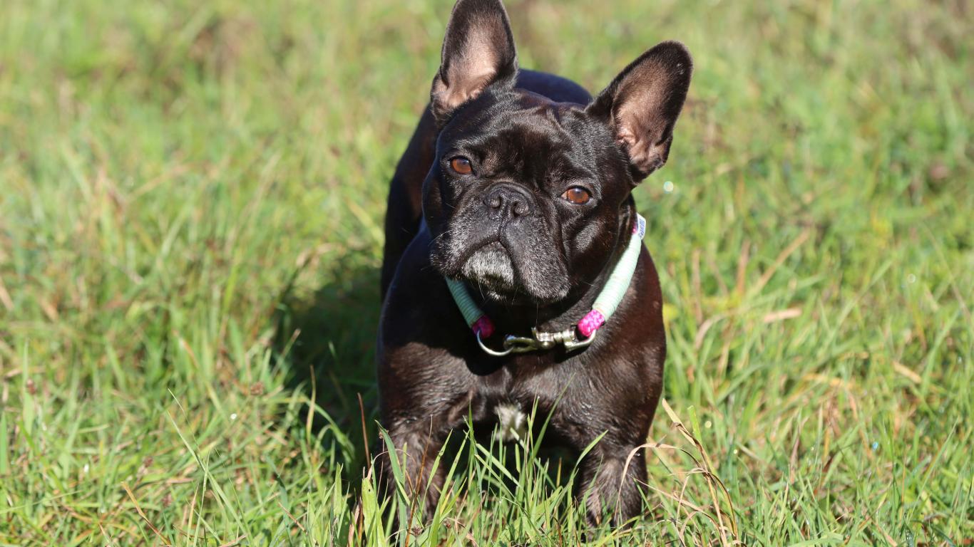 Обои Черный французский бульдог на зеленой траве
