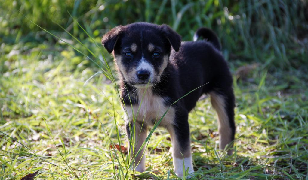 Обои Маленький щенок стоит на зеленой траве