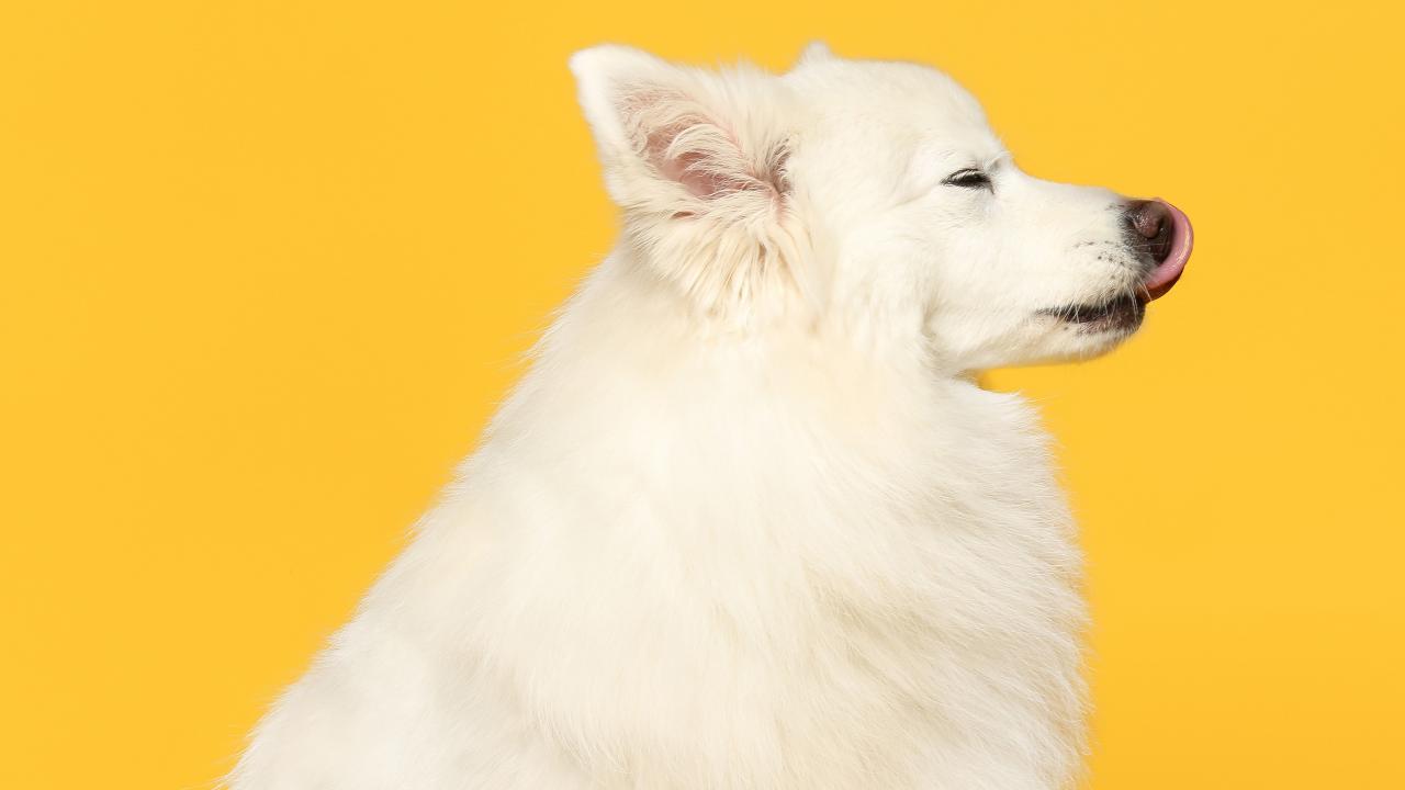Обои Белый шпиц с высунутым языком на желтом фоне