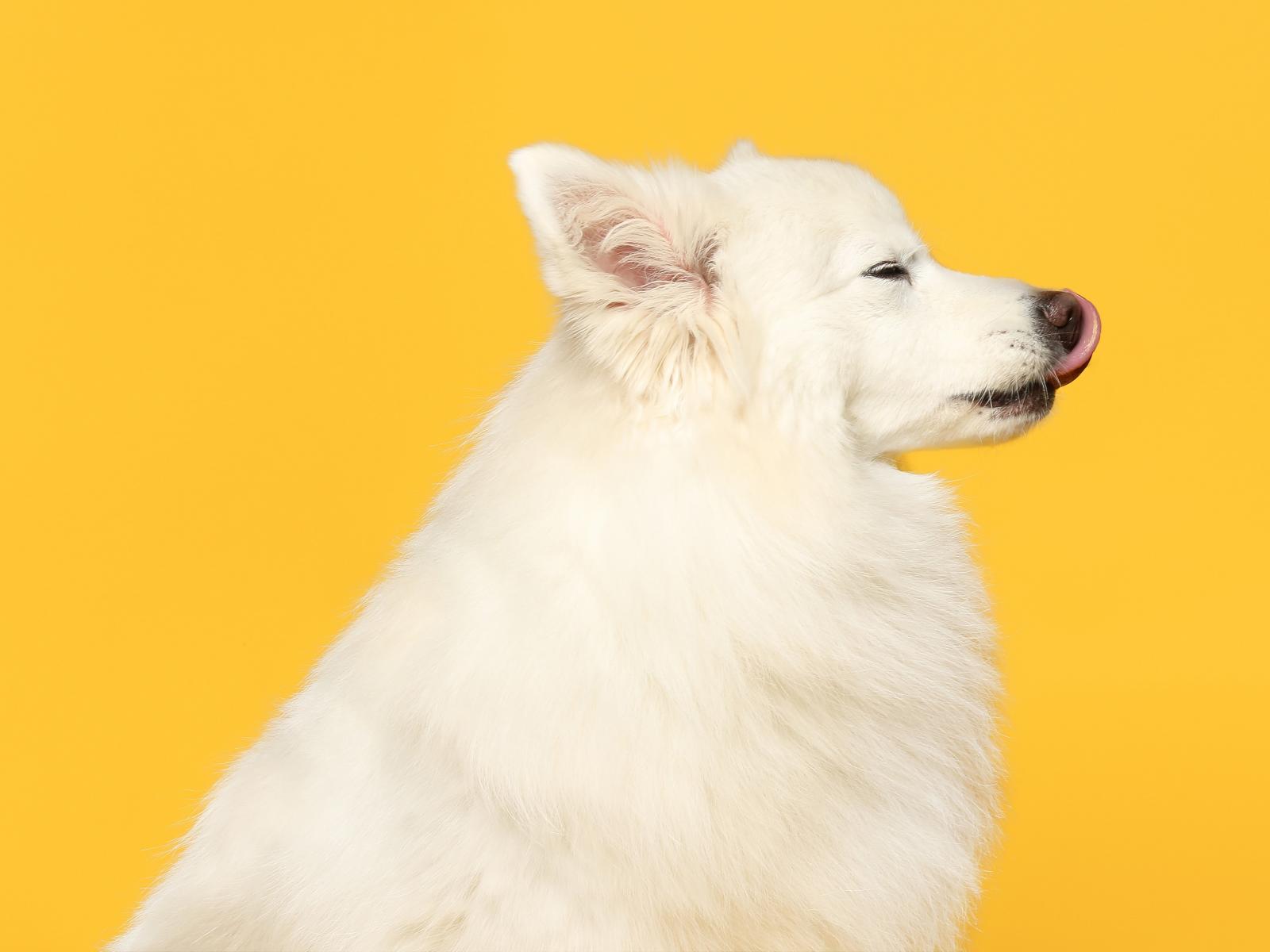 Обои Белый шпиц с высунутым языком на желтом фоне