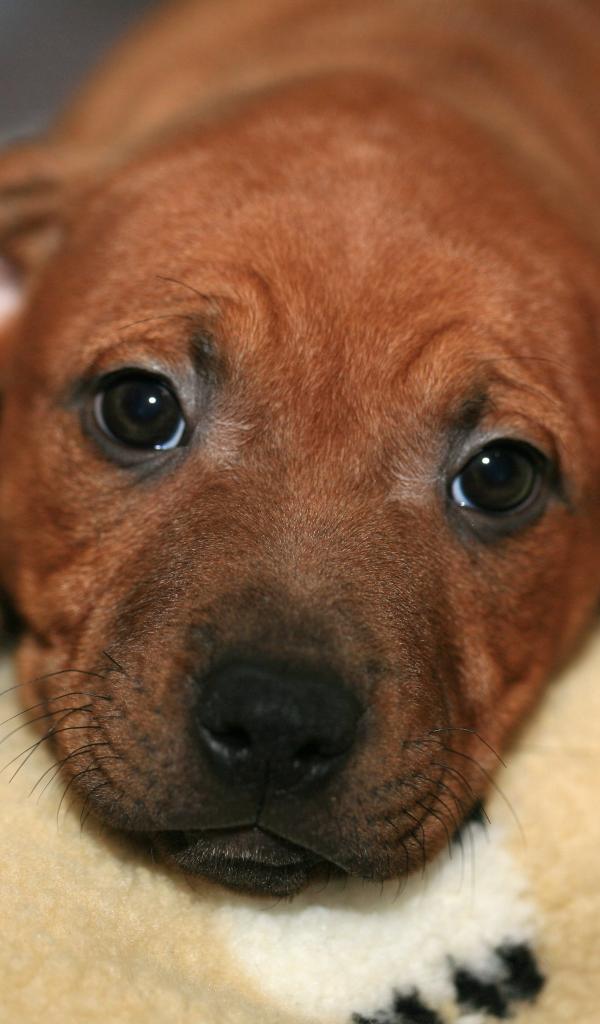 Обои Маленький щенок стаффордшир лежит на кровати
