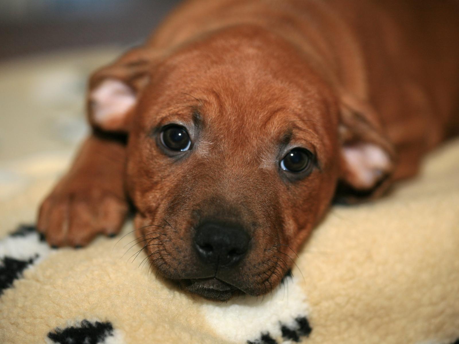 Обои Маленький щенок стаффордшир лежит на кровати