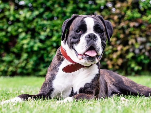 Обои Большой боксер с открытой пастью лежит на траве