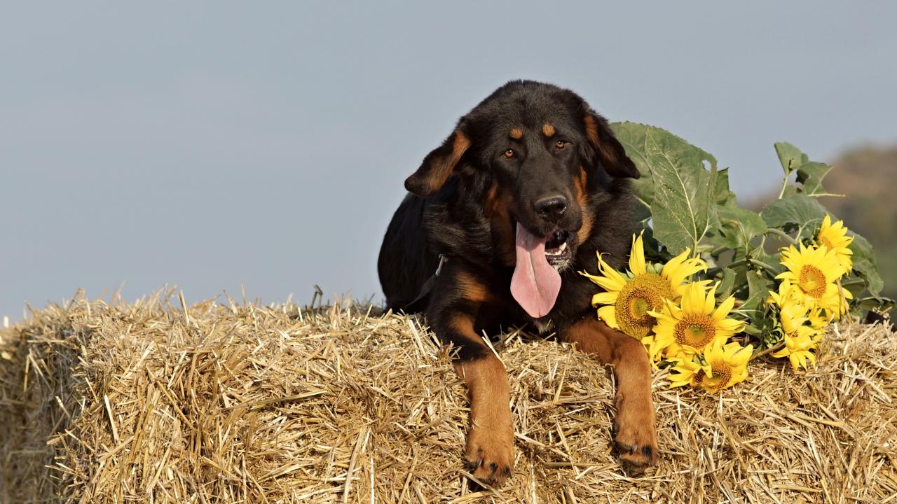 Обои Тибетский мастиф с высунутым языком лежит на соломе