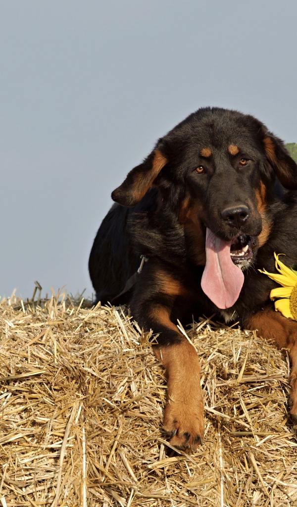Обои Тибетский мастиф с высунутым языком лежит на соломе